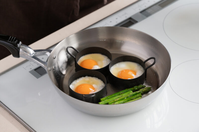 一つのフライパンの中でも複数のおかずが混じり合うことなく、同時進行で作ることができる。きれいな丸い目玉焼きを手軽に作ることができれば、月見バーガーや、ガパオライスなんかにも使えそう。お子さんと一緒に小さいパンケーキを作ったりしても楽しいかも……。