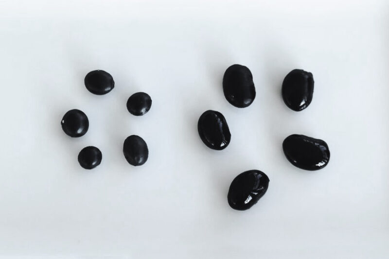 ▼浸水前と12時間後。黒豆はしっかり水を吸って、ふっくら。