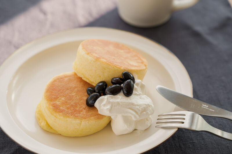 調理リング 丸で焼いたパンケーキに、生クリームと合わせてに添えてみました。黒豆が甘さ控えめなので、生クリームとパンケーキとも相性抜群です。