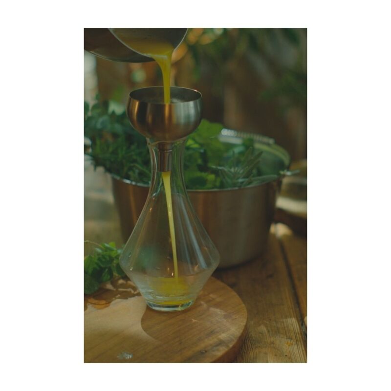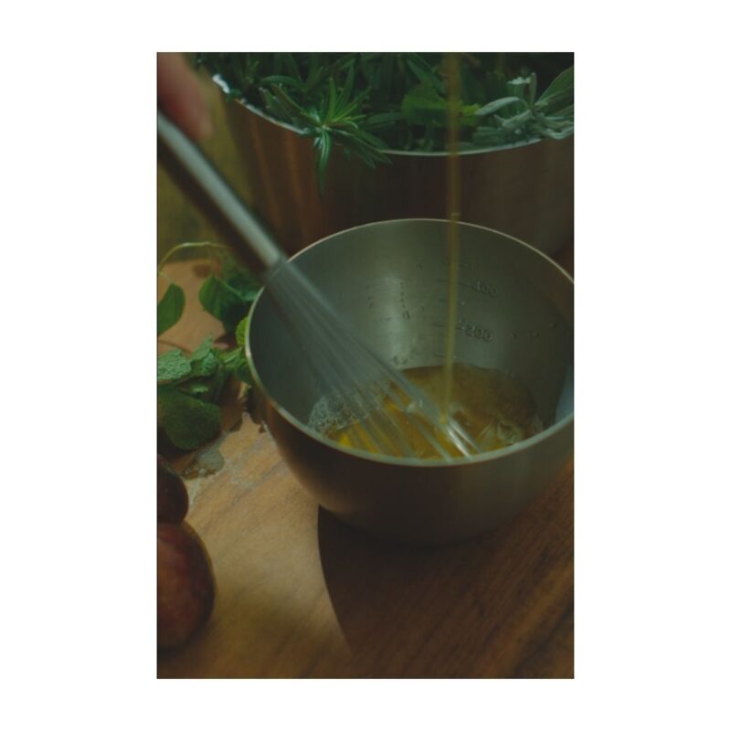 ❷混ぜながらゆっくりとオリーブオイルを注ぎ、乳化させて完成。