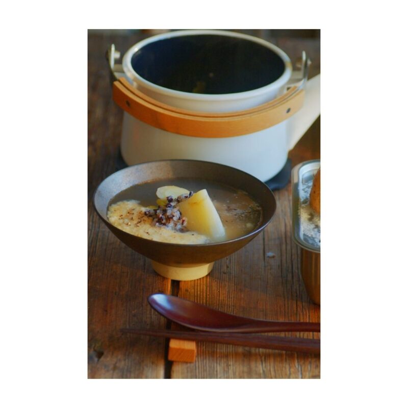 ❺煮込んだ具材を器に盛り付け、スープも注いだら、すりおろした山芋を添えて完成。