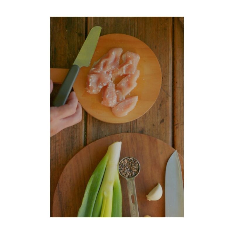 ❶塩麹をまぶしておいた鶏のささみを一口大に切り、小鍋(口の大きなやかんでも可)へ入れていく。