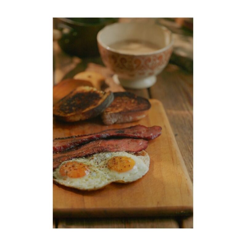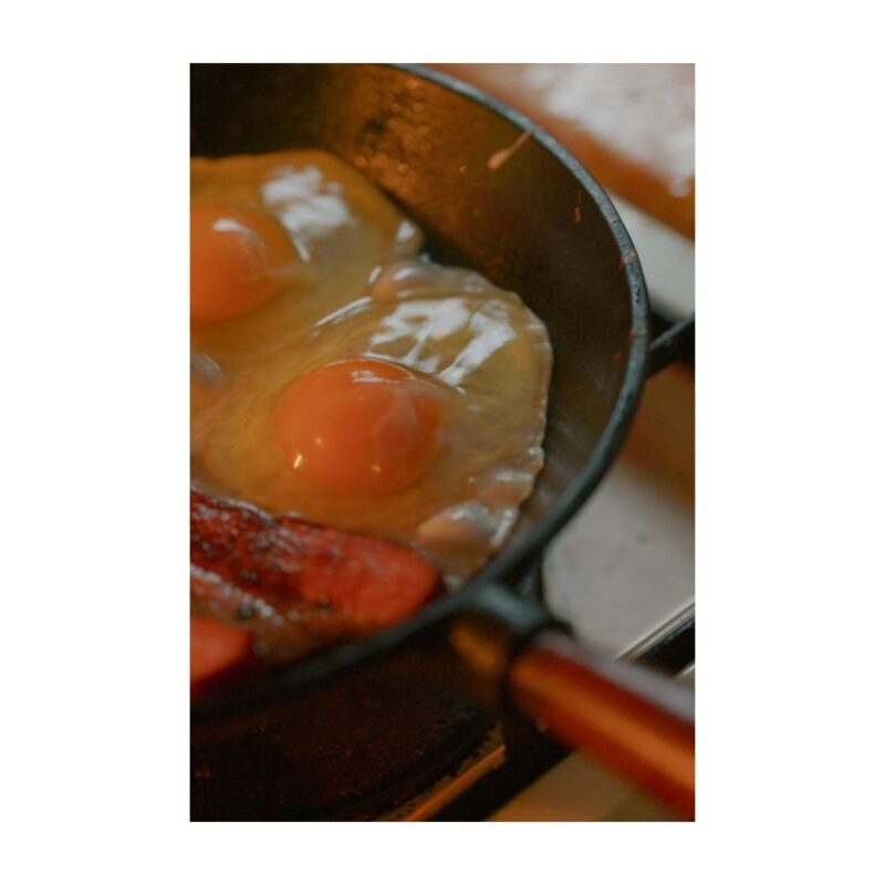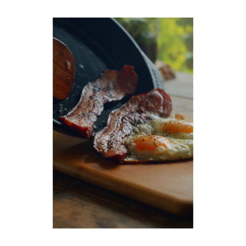 映画のワンシーンに出てくるような、炎の上でジュージュー焼かれるベーコンエッグ。