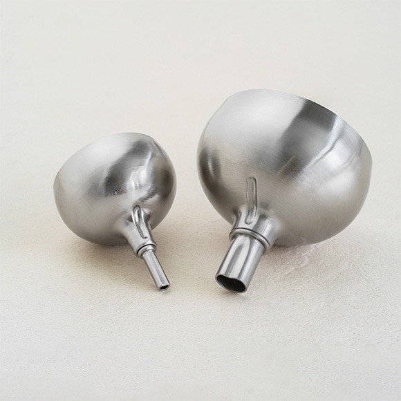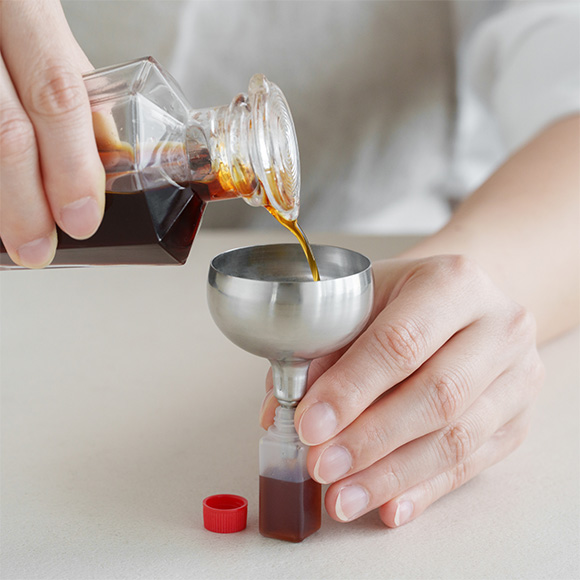 タレビンなどの口径の小さな容器には、じょうごを少し浮かせた状態で注いでください。