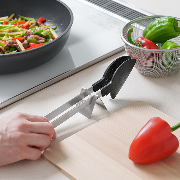開いてかさばるトングの置き場所に。調理スペースや卓上、引き出しなどでの収納、どこでもトングを閉じたまま置けるので場所を取りません。